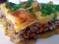 材料:ミンチ肉500グラム、ジャガイモ1キログラム、トマト2−3個、タマネギ2個、コショウ、レッドペッパー、