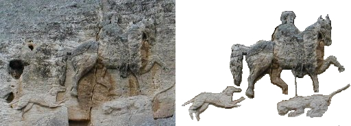 馬に乗った人(騎士)、猟犬、ワシとイノシシの姿を8世紀に浮き彫りにしたマダラの騎士像はブルガリア 北東部のマダラ高原にある。地上23メートルの高さに刻まれた縦2.5m、横3 mのレリーフはどのように 作成されたかいまだに不明である。馬の足元に横たわるライオンに槍を突き刺している、 ワシが騎士の前を飛び、犬が騎士の後ろに従っているという情景は、象徴的な形で戦勝を 描いていると見なされている。騎士像は8世紀のブルガリアの王様テルヴェルを描いている説がある。 テルヴェル王様はアラブ人の危機を予告し、巨大ライバルでありながらビザンチン帝国の首都 コンスタンチノーポルをアラブ人の包囲から救った。その結果アラブ人はアジアから ヨーロッパへの侵入が止められた。