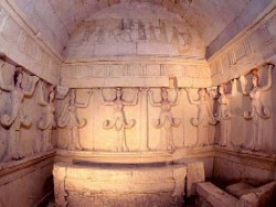 スヴェシュタリのトラキア人の墳墓は、ブルガリア北東部に残る古代の墓地。 イスペリフ市(Исперих、Isperih)スヴェシュタリ村(Свещари、Sveshtari) の南西2.5 km. 1982年に小さい丘から発見された墓地で、紀元前3世紀に遡る。 当時のトラキア人の宗教建築の基本的な構造原理を伝えてくれる遺構である。建築上の装飾では、 多彩色の半人半植物女人像の柱と、彩色された壁画とが、非常にユニークなものとして目を惹く。 10体の女人像柱は、中央の玄室の壁に浮き彫りの形で掘り込まれたもので、 それに被さる丸天井には、半円壁画の装飾が施されている。こうした例は、 トラキア地方ではこれまでには他に見つかっていない。この墓地は、古代の地理学者 が言うところの、ヘレニズム世界やヒュペルボレイオスの世界に出会ったトラキア の一種族ゲダイ人の文化を伝える貴重な例証である。